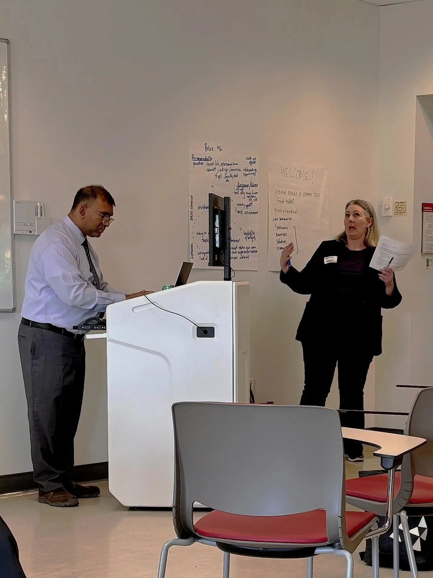 [Image description: Mahadeo Sukhai, Co-founder, in the midst of giving a lecture. He stands across a laptop on a podium. There’s a woman in all black attire across from him.]